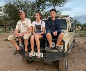 Safarijeepen är en fyrhjulsdriven Land Cruiser utrustad med eluttag där man kan lyfta taket för att få en perfekt vy över savannen.